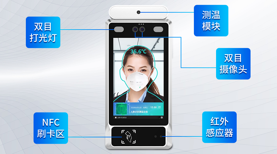 在人臉識別智能終端廣泛應用的情況下,觸想智能推出了自己的人臉識別測溫終端解決方案。目前在人員管控方面應用較多的是8寸人臉識別測溫終端,主要特點:雙目200萬高清攝像頭、雙LED補光燈、測溫模塊、NFC/RFID/身份證讀卡器、人體接近傳感器。