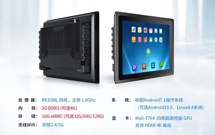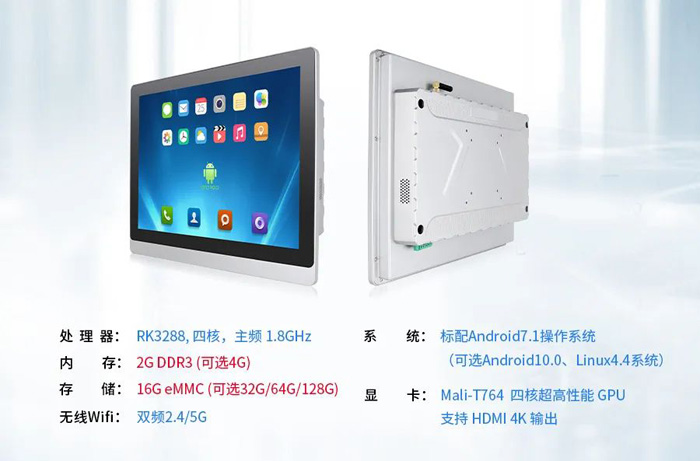 對比普通A64配置的安卓一體機,C款嵌入式系列產品在性能上搭載RK3288四核處理器,主頻1.8GHz (2G DDR3 存儲16G eMMC(可選32G)),標配Android7.1操作系統(可選10.0/Linux4.4系統)。性能強大,能夠快速有效完成數據處理與運算連接。