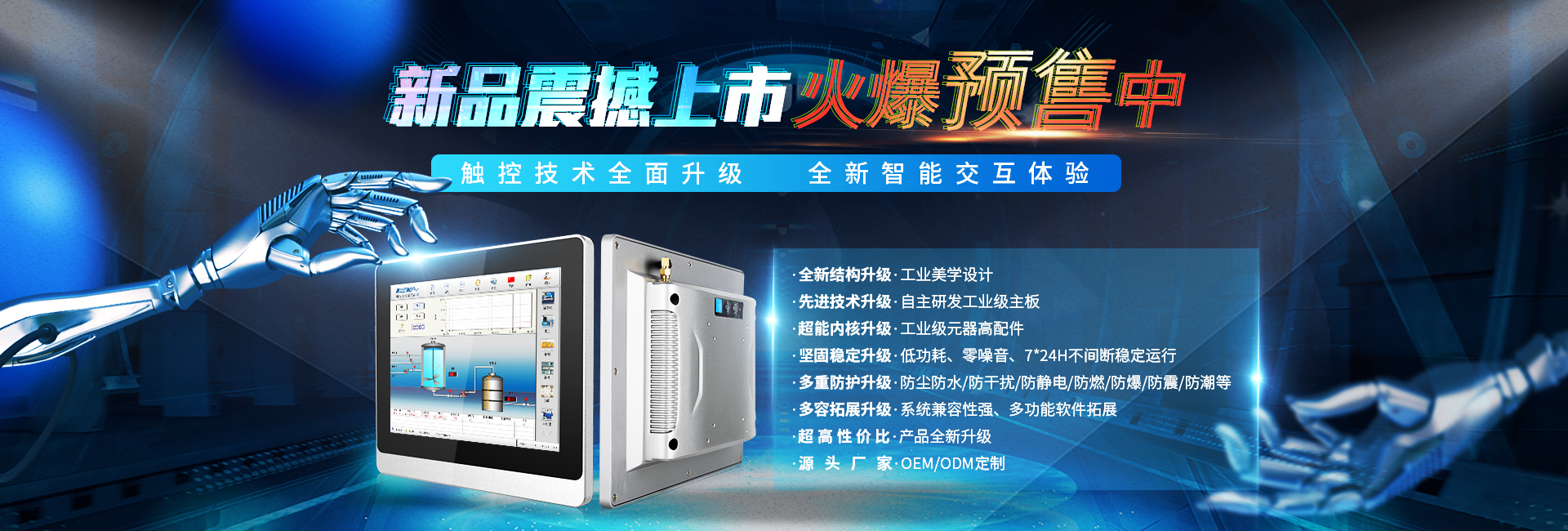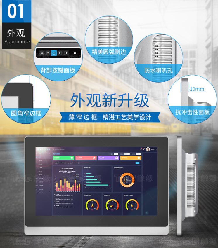 產品面板采用純平無縫隙設計,可高達IP65防塵防水等級,增強型面板具備強防摔性、抗沖擊性、抗磁電干擾性、可塑性、導熱性等特征,能適應各種惡劣環境,延長產品使用壽命。