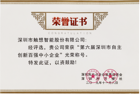 深圳市觸想智能股份有限公司(簡稱:觸想智能)憑借優異的自主創新實力,榮獲“深圳市自主創新中小企業百強”稱號!本次評選活動是經過審核評估組專家前期的實地考察、聽取自主研發創新的工作匯報、與研發人員的技術交流、了解產品的核心競爭優勢以及企業的未來發展規劃等工作進行了全面的評估,在近3000家報名企業中,經過嚴格的評選程序脫穎而出,成為深圳市200多萬中小企業的優秀代表之一!
