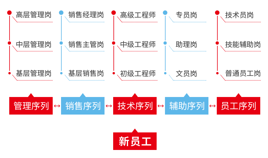 根據員工的個人職業規劃及綜合素質,公司提供雙向職業發展通道,可以縱向發展為專業型人才,也可以橫向發展為全能型人才,具體為: